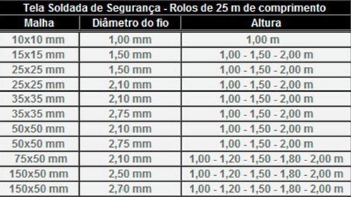 - Tabela de telas galvanizadas