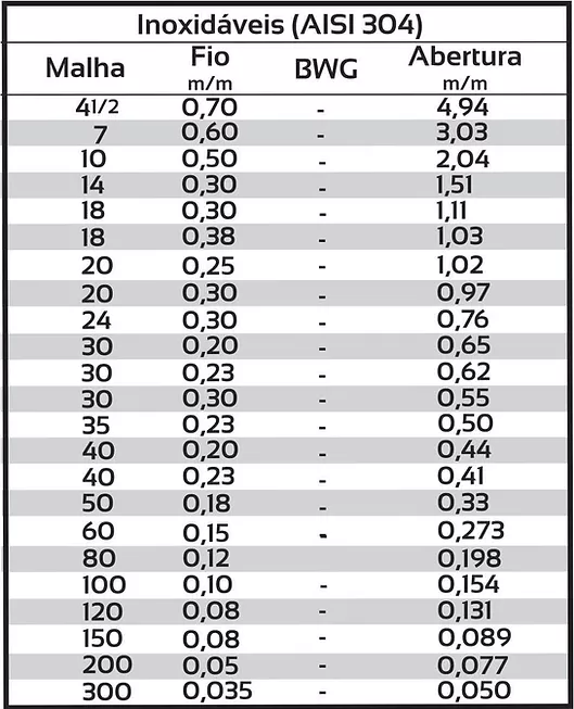 - Tabela de telas inoxidáveis (AISI 304)